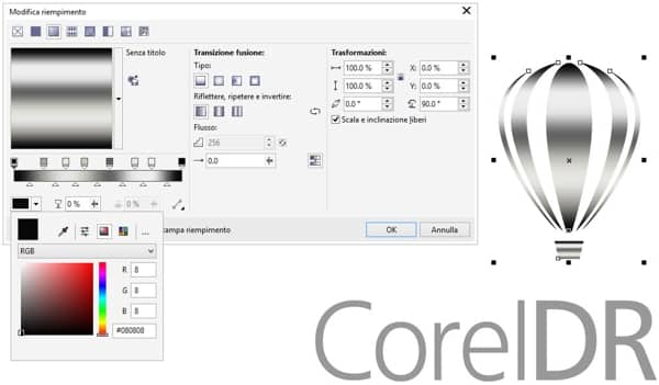 Selezionare solo il primo oggetto (mongolfiera). Premere F11 per aprire le impostazioni Riempimento sfumato e modificare i colori del gradiente il più possibile per renderlo simile all'esempio seguente: