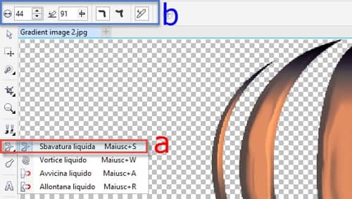 Selezionare lo strumento Sbavatura liquida dalla Casella degli strumenti (a) e regolare le dimensioni del pennino, la pressione, la pressione della penna, ecc.