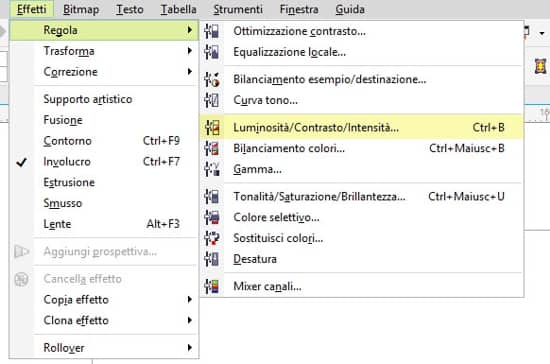 Ora selezionare i singoli oggetti (mongolfiera e testo) e regolare Luminosità/Contrasto/Intensità. Selezionare: Effetti > Regola > Luminosità/Contrasto/Intensità
