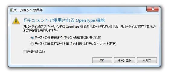 [保存] ボタンをクリックするとダイアログ ボックスが表示され、ドキュメントを編集可能バージョンと非編集バージョンのどちらで保存するかを選択できます (図 11 を参照)。[テキストの編集可能性を維持] を選択すると、OpenType 機能が削除されて置換されますが、文字は編集可能なテキストのまま保存されます。非編集バージョンの [テキストの外観を維持] を選択すると、互換性のない OpenType テキストがカーブに変換されます。文字をテキストとして編集することはできなくなり、ベクトルとして編集することになります。