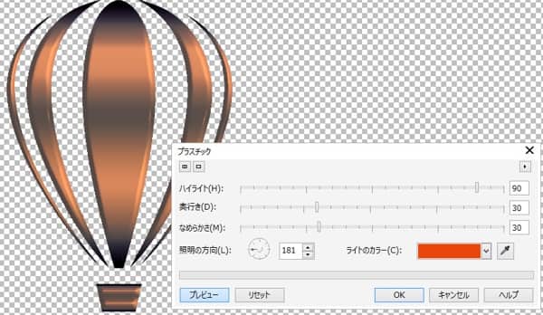 PHOTO-PAINT でオブジェクトを選択し、効果 > テクスチャ > プラスティック...を選択します。