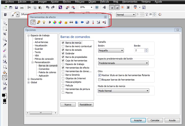 Si aplicas efectos a tu imagen con frecuencia, puede que te resulte práctico incluir la barra de herramientas Herramientas de efecto en el espacio de trabajo de PHOTO-PAINT.