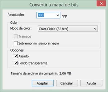 Conviértelo en mapa de bits (Mapas de bits > Convertir a mapa de bits), con la casilla Fondo transparente activada y RGB o CMYK como Modo de color en función de tu flujo de trabajo.
