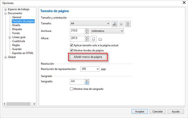 - Abre un archivo nuevo (Archivo > Nuevo o Ctrl+N) y, en Diseño > Preparar página, haz clic en Añadir marco de página (también puedes añadir un marco de página haciendo doble clic en la herramienta Rectángulo de la caja de herramientas).