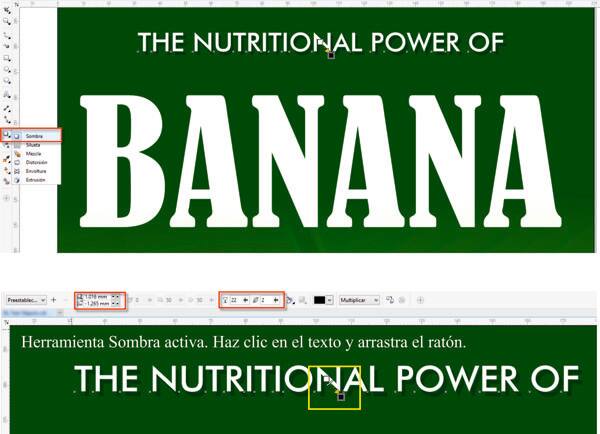 - Selecciona el texto "The Nutritional Power..." y haz clic en la herramienta Sombra (Caja de herramientas > Sombra). Arrastra el ratón desde el texto para crear la sombra y ajusta los parámetros de la sombra en la barra de propiedades.