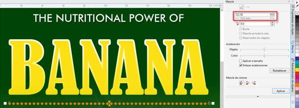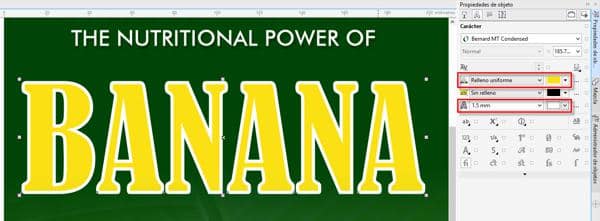 - Selecciona el siguiente objeto de texto (Banana) y rellénalo con un color amarillo y aplícale un contorno blanco de 1,5 mm de grosor mediante Propiedades del texto en la ventana acoplable Propiedades de objeto.