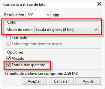 - Convierte la copia en un mapa de bits: Mapa de bits > Modo de color > Escala de grises (8 bits). Comprueba que está activada la opción Fondo transparente.