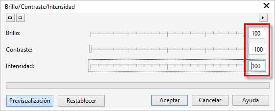 - Selecciona Efectos > Ajustar > Contraste/Brillo/Intensidad (Ctrl+B). Acentúa el contraste para oscurecer la imagen lo más posible. Establece el Brillo y la Intensidad al mínimo.
