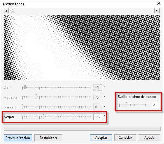 - Selecciona Mapa de bits > Transformación de color > Medios tonos. Ajusta los parámetros de punto máximo y negro. (Aquí he definido el valor punto máximo en 4 y el de negro en 112.)