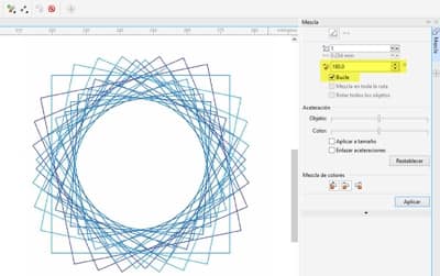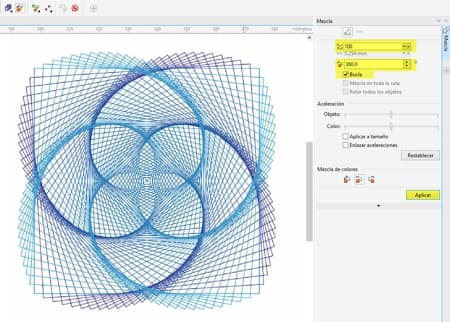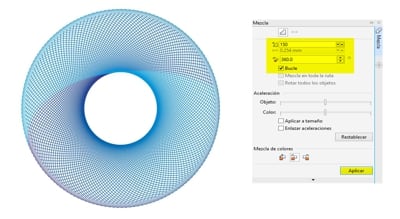 - Vuelve a seleccionar el grupo de mezcla y abre la ventana acoplable Mezclar. Cambia "Objetos de mezcla" a 100 pasos (el valor predeterminado es 20) y la "Dirección de mezcla" a 360 y haz clic en Aplicar.