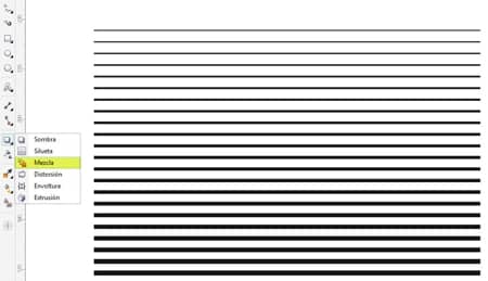 - Activa la herramienta Mezcla interactiva en el menú lateral de herramientas Efectos. Arrastra la herramienta de una línea a otra (no importa el orden en este caso). El resultado debería ser un degradado de líneas.