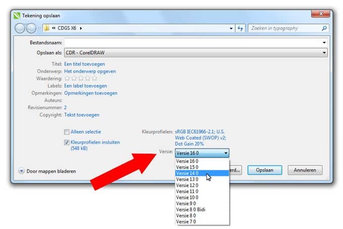 Er zijn nog veel meer nieuwe typografische functies in CorelDRAW X6 beschikbaar. U kunt bijvoorbeeld zelfs het resultaat van deze nieuwe tekstfunctie opslaan voor oudere versies van CorelDRAW, hoewel de nieuwe functies mogelijk niet worden ondersteund in oudere versies. Klik op Bestand > Opslaan als en kies een oudere versie (zie afb. 10). Er wordt een dialoogvenster weergegeven.