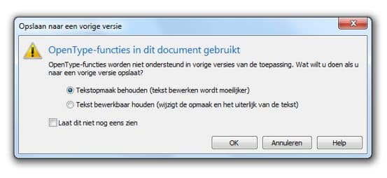 U kunt nu kiezen om het document voor een oudere versie op te slaan als bewerkbare of niet-bewerkbare versie (zie afb. 11). Als u Tekst bewerkbaar houden kiest, worden de OpenType-functies door CorelDRAW verwijderd en vervangen, zodat de tekst gewoon bewerkbaar blijft. Als u de niet-bewerkbare versie kiest via Tekstopmaak behouden, wordt de niet-compatibele OpenType-tekst door CorelDRAW omgezet in krommen. U kunt de tekst vervolgens niet als gewone tekst bewerken, maar alleen als vectorafbeelding.