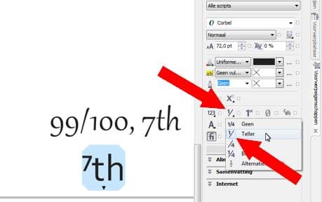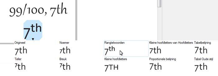 Rangtelwoord: Voorbeelden hiervan zijn eerste, tweede, zevende enz. Lettertypen die deze functie ondersteunen, zetten ze om in: 1e, 2de, 7e enzovoort met aangepaste weergave als u ze in cijfers en letters schrijft.