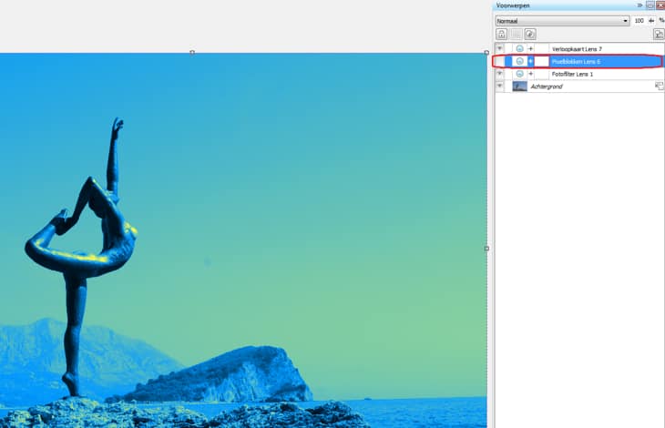 Door meerdere lenzen te combineren, kunt u abstracte en verrassende effecten bereiken. U kunt bijvoorbeeld afzonderlijke lenslagen verbergen door op het pictogram Weergeven/verbergen naast een laag te klikken.