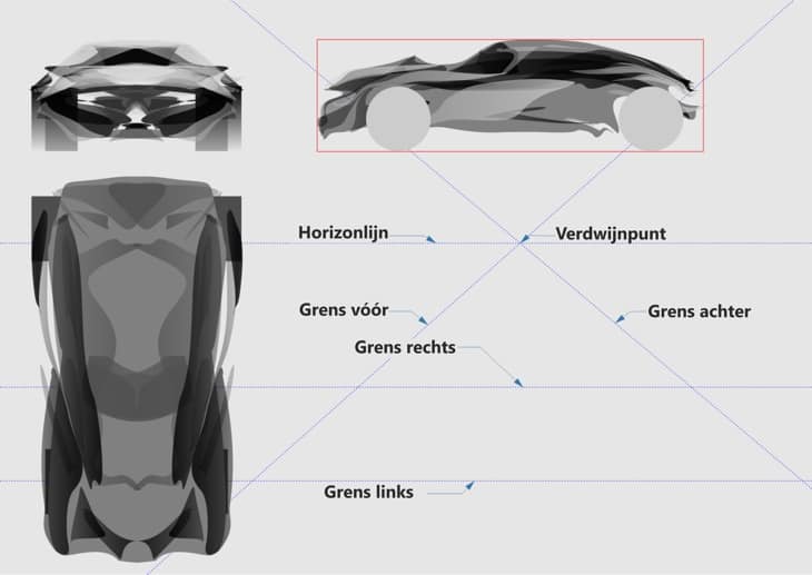 In het autodesign zijn er bepaalde termen die bij elk ontwerp worden gebruikt. Deze verwijzen naar de kenmerken die alle auto's gemeen hebben, ongeacht het type of de vorm. In ons ontwerp zien we drie belangrijke lijnen die de boven- en zijweergave gemeen hebben, en waarmee we bepaalde punten in perspectief kunnen projecteren.