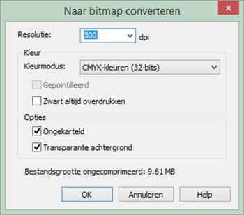 Converteer de vorm naar een bitmap (Bitmaps > Naar bitmap converteren), schakel het selectievakje Transparante achtergrond in en kies de gewenste Kleurmodus, RGB of CMYK.