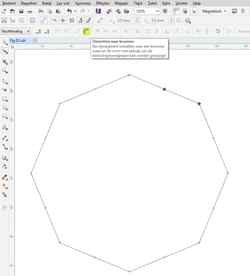 Twee knooppunten worden gemarkeerd en in de eigenschappenbalk ziet u opties voor het bewerken van knooppunten. Klik op het pictogram Naar krommen omzetten.