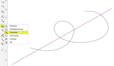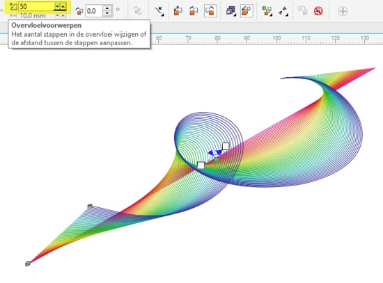 De abstracte vorm of de overvloeigroep vormt geen gewone groep voorwerpen. In plaats hiervan vertonen de lijnen (die oorspronkelijk de begin- en eindvorm waren) een dynamisch gedrag. Deze worden dan ook besturingsvoorwerp genoemd. Wanneer u een besturingsvoorwerp kiest, kunt u hierin wijzigingen aanbrengen (positie, formaat, kleur, streek, enz.). De voorwerpgroep wordt automatisch bijgewerkt met deze wijzigingen.