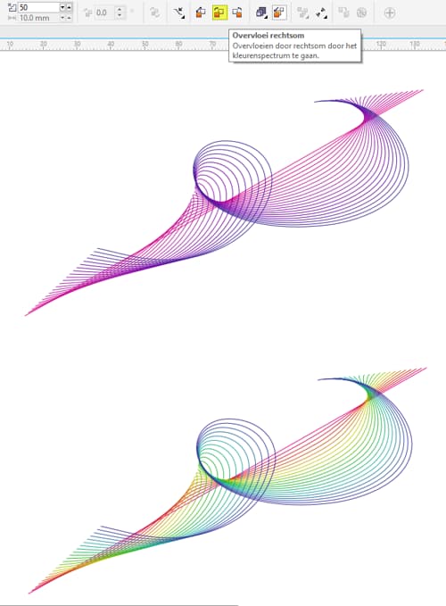 Klik ten slotte op de overvloeigroep om de kleur van de abstracte vorm te wijzigen en een veelkleurig effect te bereiken. Klik op het pictogram Overvloei rechtsom op de eigenschappenbalk bovenin. U ziet dat de richting van het kleurenwiel wordt gewijzigd en er een abstracte vorm met meerdere verlooptinten ontstaat.