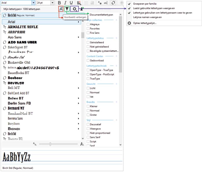 Een systeem kan over een paar of over duizenden niet-geïnstalleerde lettertypen beschikken. De beschikbare lettertypefiltercategorieën zijn: Lettertypestatus, Content Center, Gewicht, Breedte, OpenType, enzovoort. U beschikt over meer dan 50 in categorieën ingedeelde filters voor het beheer van de lettertypen die u wilt weergeven en gebruiken.