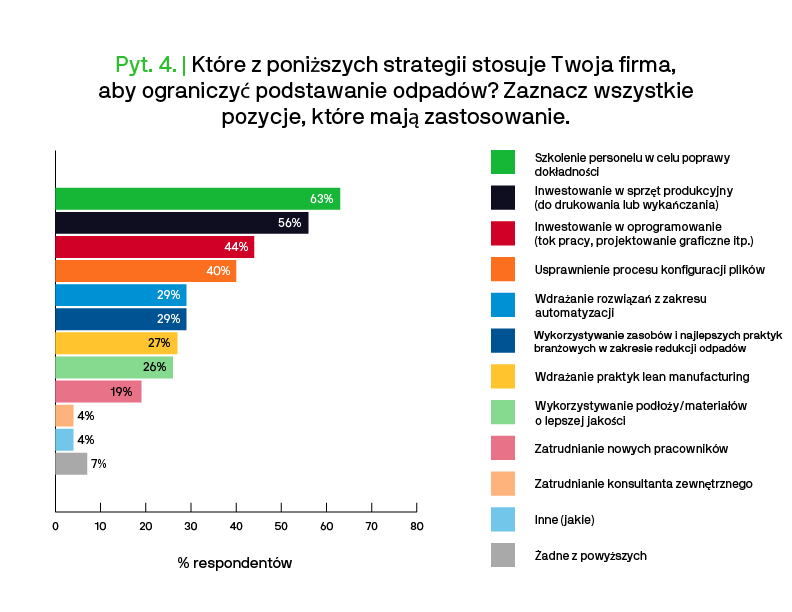 Drugą najczęstszą strategią ograniczania ilości odpadów jest zwiększenie inwestycji w sprzęt produkcyjny, a konkretnie w maszyny drukarskie oraz urządzenia do wykańczania druku. Tymczasem mniej niż połowa respondentów (44%) stwierdziła, że zainwestowała w rozwiązania w zakresie oprogramowania, które pozwalają ograniczyć ilość odpadów.