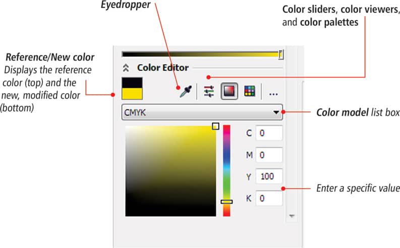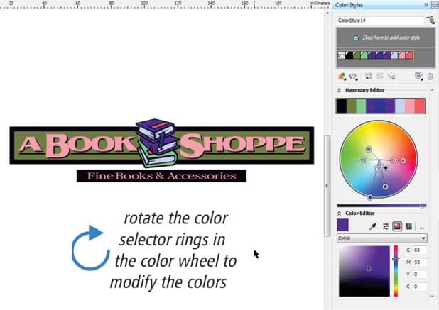 Teraz już można edytować gradient koloru za pomocą Edytora harmonii. Zwróć uwagę, że różne schematy kolorów są automatycznie odzwierciedlane w okręgach wraz ze zmianą położenia dowolnego z okrągłych uchwytów w obszarze Edytora harmonii (patrz rysunek 11).