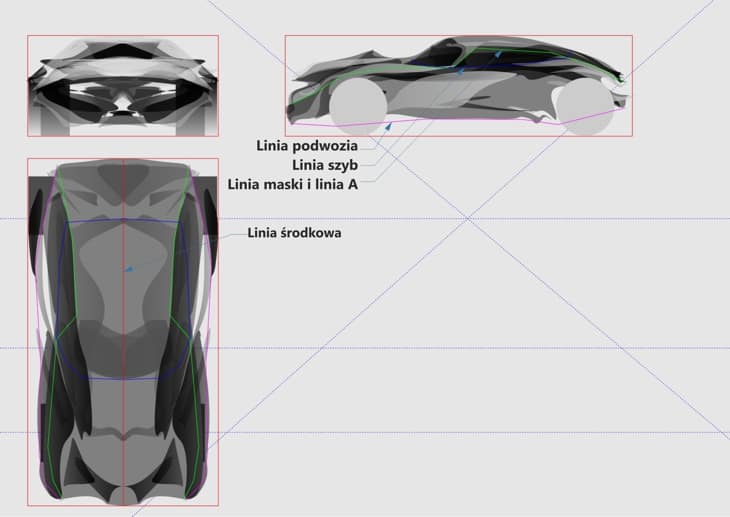 W branży projektowania samochodów w każdym projekcie stosuje się pewne pojęcia, które wskazują cechy wspólne wszystkich samochodów, bez względu na ich typ i sylwetkę. W naszym projekcie oznaczymy trzy główne linie, wspólne dla widoku z góry i bocznego, aby ułatwić sobie rzutowanie punktów w perspektywie.