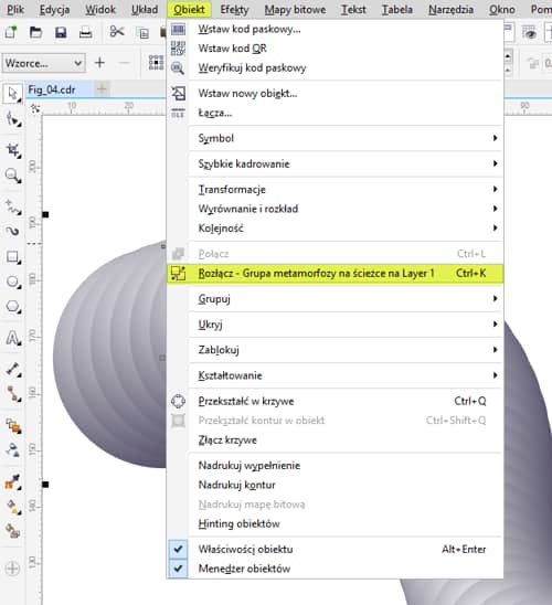 Ścieżkę można usunąć po uzyskaniu satysfakcjonującego rezultatu, gdy nie będzie już konieczna zmiana właściwości elementów biorących udział w procesie. W tym celu przejdź kolejno do menu obiektu > Rozłącz - Metamorfoza. Następnie kliknij ścieżkę i usuń ją klawiszem Delete.
