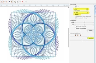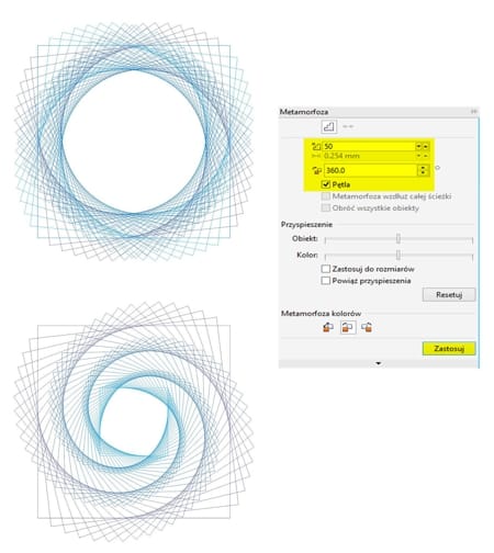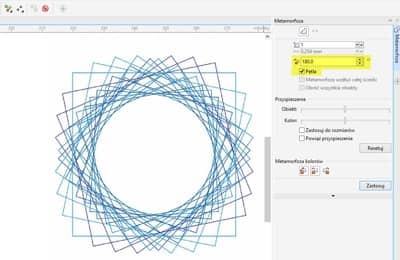- Wybierz ponownie grupę metamorfozy, a następnie przejdź do okna dokowanego Metamorfoza. Zmień liczbę kroków metamorfozy obiektów na 100 (domyślna wartość to 20) oraz kierunku obrotu metamorfozy na 360, a następnie kliknij przycisk Zastosuj.