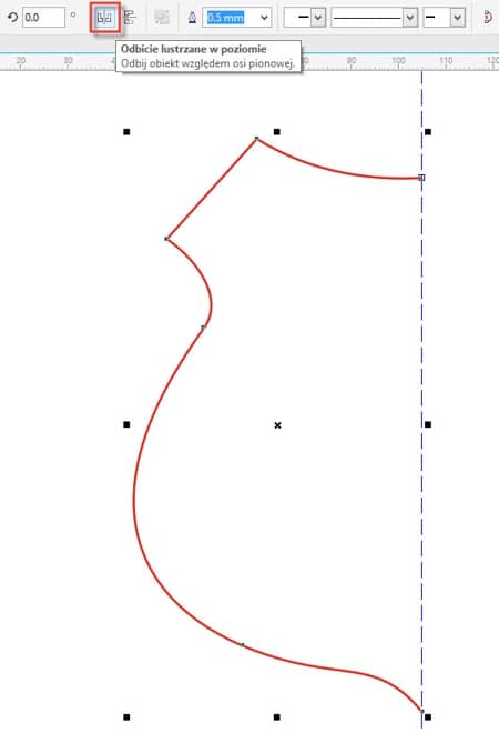 Można także skorzystać z opcji utworzenia odbicia lustrzanego w celu odwrócenia kopii i umieszczenia jej po drugiej stronie. Zaznacz figurę, naciśnij klawisz + na klawiaturze numerycznej, a następnie kliknij ikonę Odbicie lustrzane w poziomie na pasku właściwości. Przeciągnij skopiowany obrazek na drugą stronę, przyciągając go do prowadnicy, a następnie wyrównaj obie połowy. Aby ruch odbywał się wyłącznie w poziomie, podczas przeciągania przytrzymaj wciśnięty klawisz Ctrl.
