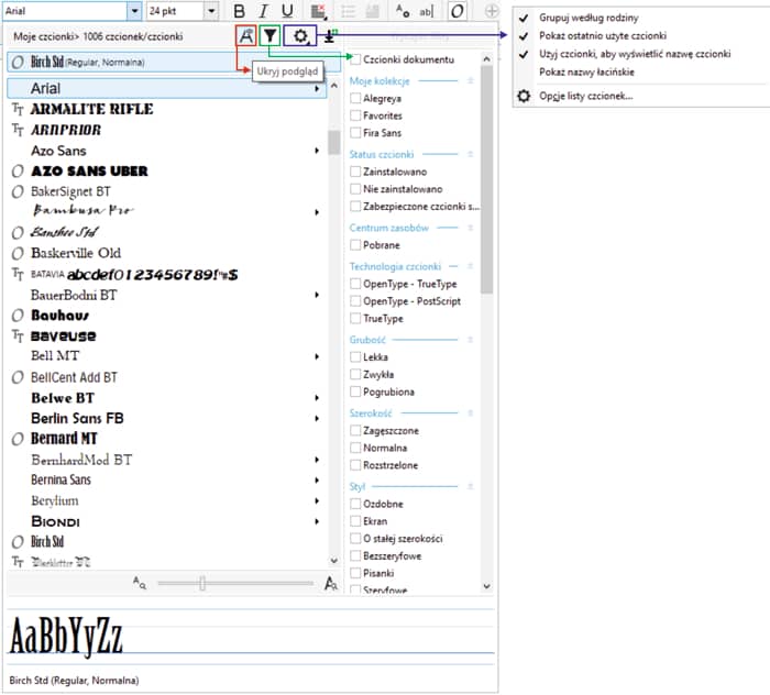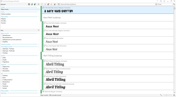 W systemie może być kilka zainstalowanych i tysiące odinstalowanych czcionek. Dostępne są następujące kategorie filtrów czcionek: Status czcionki, centrum zasobów, grubość, szerokość, OpenType itp. Do zarządzania wyświetlanymi i używanymi czcionkami dostępnych jest ponad 50 filtrów podzielonych na kategorie.