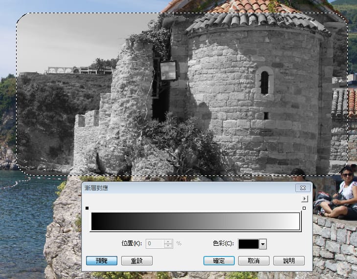「漸層對應」濾鏡可讓您將色彩套用至黑白影像或變更彩色影像的色彩。