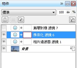 在「物件」泊塢視窗中,請注意在個別圖層上已相互堆疊所有 3 個濾鏡。