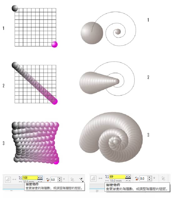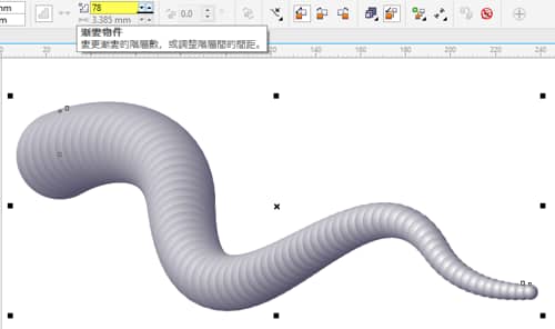 您也可藉由增加漸變步驟數或變更第一或第二物件大小以強化此效果。漸變工具是互動性非常高的工具。您可以在製作漸變圖形同時,查看圖形在螢幕上的變化。