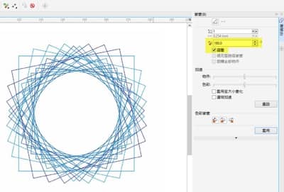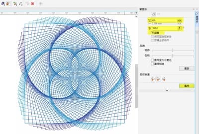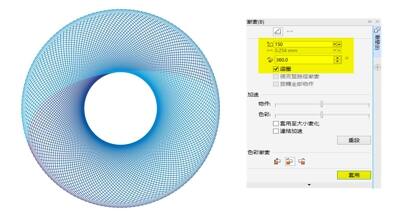 - 再次選取漸變群組,前往漸變泊塢視窗。變更漸變物件至 100 個階層(預設為 20),及漸變方向為 360,接著按一下應用。