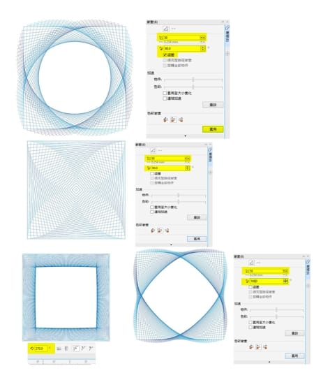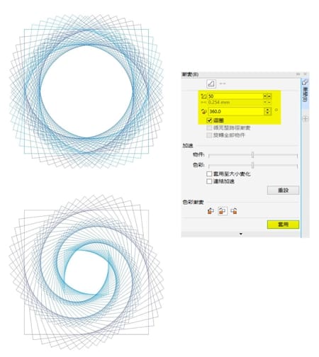 - 至此,我們使用了二個相同大小的正方形,如果大小不同會有怎樣的結果?變更數值至 50 個階層,360º 的迴圈,接著按一下應用。選擇其中一個正方形,並將其放大或縮小。
