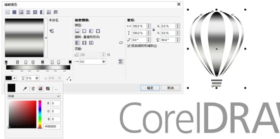 僅選取第一項物件 (即氣球圖像)。按下 F11 鍵以開啓漸層填色設定,然後盡可能依下方範例所示編輯漸層色彩: