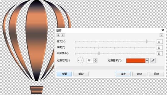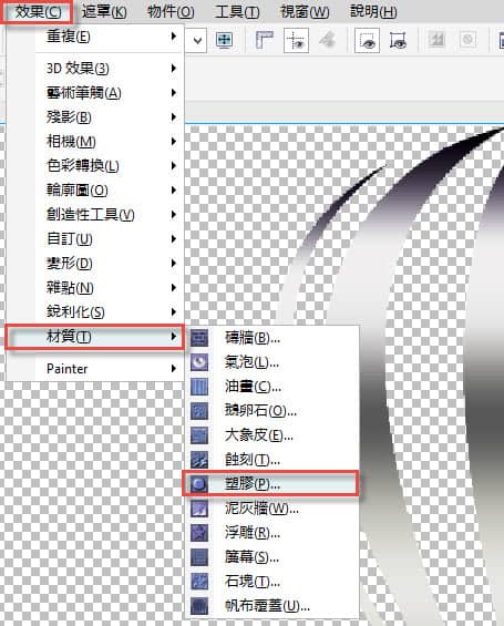 請在 Photo-PAINT 中選取該物件,然後點按:效果 > 材質 > 塑膠...。